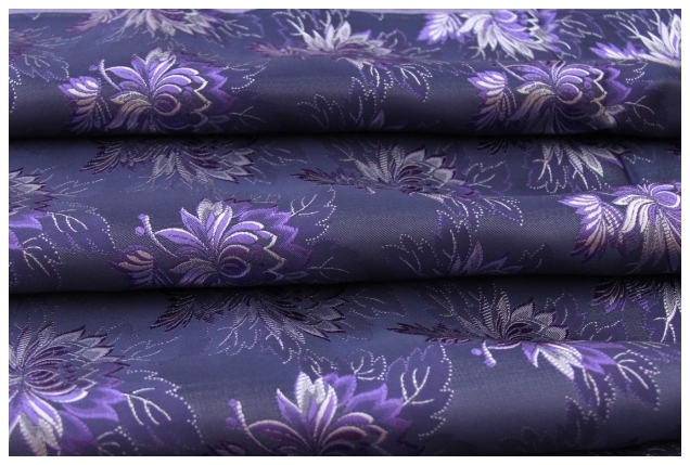 Farba tmavý modrý podklad, fialovo biele vytkávané kvety.