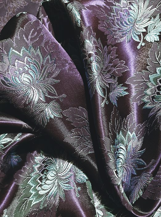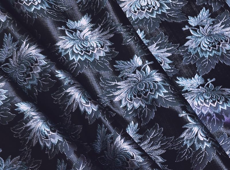 Farba tmavý modrý podklad, krásne výrazné kvety vytkané bielou a tyrkysovou farbou.