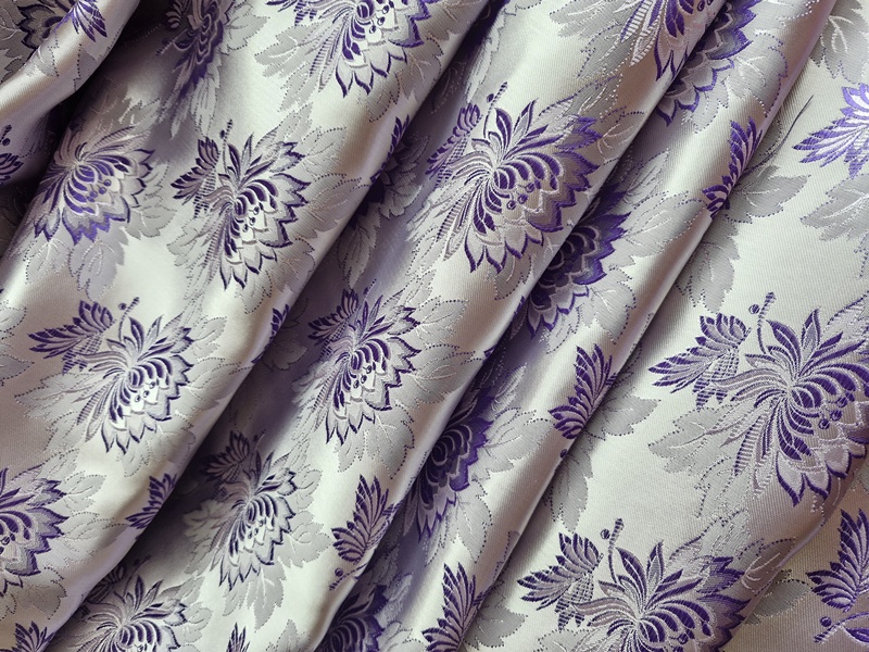 Farba: biely perleťový podklad. Kvety klasický vzor vytkané tmavšou fialovou.