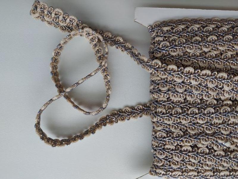 Leonský pásik  béžovo-zlatý-modrá, šírka 16 mm. Materiál 80%polyester, 10 %viskóza, 10 % kovové vlákno