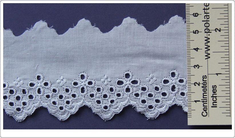 Vyšívaná madeira so šírkou 50 mm, šírka výšivky 30 mm. Materiál 100% bavlna. Farebné vyhotovenie biela. Veľkoobchodné balenie 13,8 m. Krajina pôvodu: Taliansko